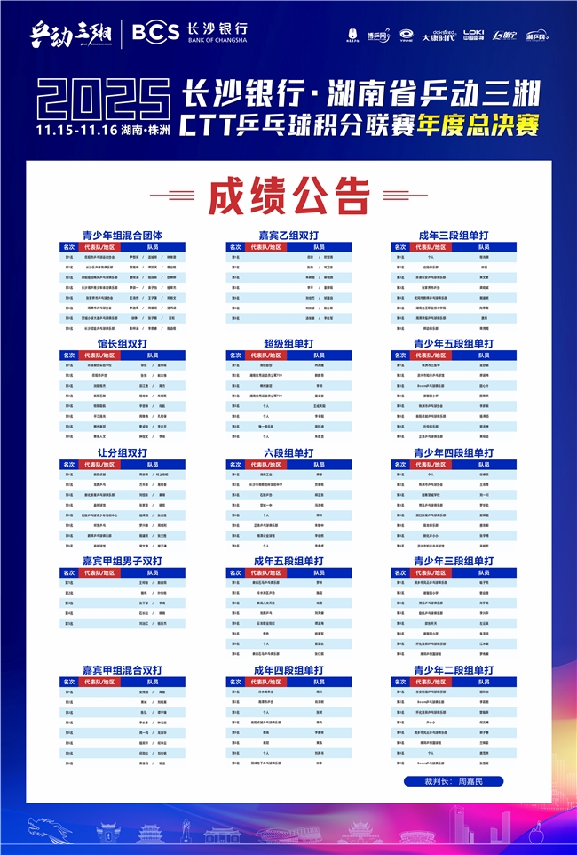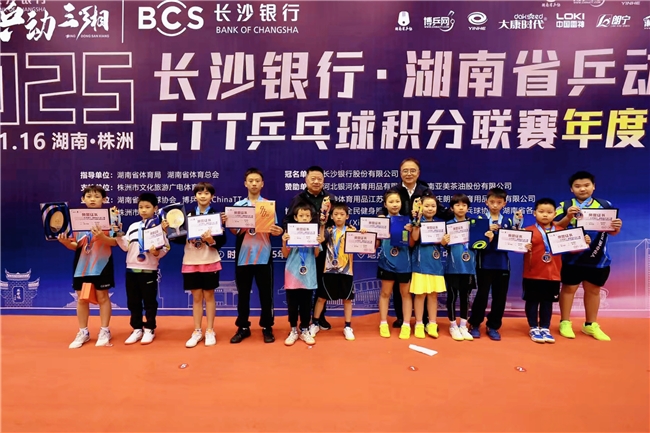 11月16日中午,伴随着最后一球的清脆声响,长沙银行・2025年湖南省“乒动三湘”CTT乒乓球积分联赛年度总决赛在株洲体育中心体育馆圆满收官,15个组别的年度总冠军尘埃落定。